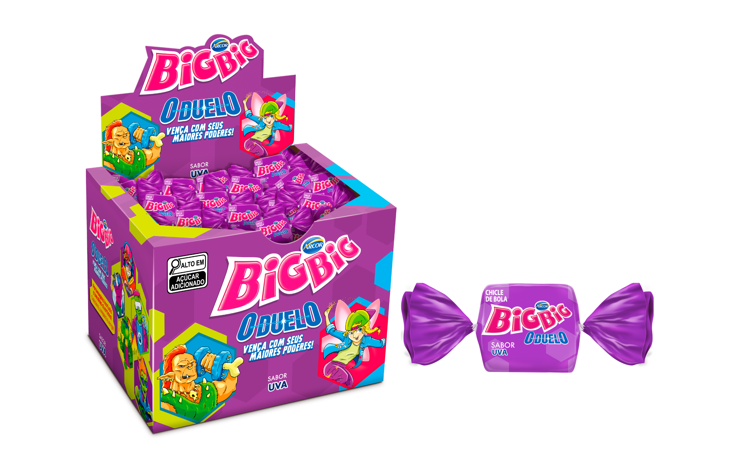 CHICLE DE BOLA, SABOR ARTIFICIAL DE UVA, COLORIDO E AROMATIZADO ARTIFICIALMENTE, INGREDIENTES: AÇÚCAR, XAROPE DE GLICOSE, GOMA BASE, ÓLEO VEGETAL DE MILHO, ACIDULANTE ÁCIDO CÍTRICO, AROMATIZANTE, EMULSIFICANTE LECITINA DE SOJA, UMECTANTE GLICERINA, CORANTES ARTIFICIAIS: VERMELHO 40 (INS 129), INDIGOTINA (INS 132) E AZUL BRILHANTE FCF (INS 133). ALÉRGICOS: CONTÉM DERIVADOS DE SOJA. NÃO CONTÉM GLÚTEN. INDÚSTRIA BRASILEIRA.
